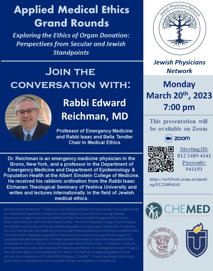 Edward Reichman is a Professor of Emergency Medicine at the Albert Einstein College of Medicine, where he also teaches Jewish medical ethics, and holds the Rabbi Isaac and Bella Tendler Chair in Jewish Medical Ethics at Yeshiva College. He received his B.A. from Yeshiva University; M.D. from the Albert Einstein College of Medicine; and Rabbinic Ordination from the Rabbi Isaac Elchanan Theological Seminary. In addition to his full-time clinical practice in Emergency Medicine at Montefiore Medical Center, Rabbi Dr. Reichman lectures internationally on Jewish medical ethics and Jewish medical history. He has edited numerous books and penned many book chapters and journal articles, and his book, The Anatomy of Jewish Law: A Fresh Dissection of the Relationship Between Medicine, Medical History and Rabbinic Literature was published jointly by Koren/OU/YU presses.